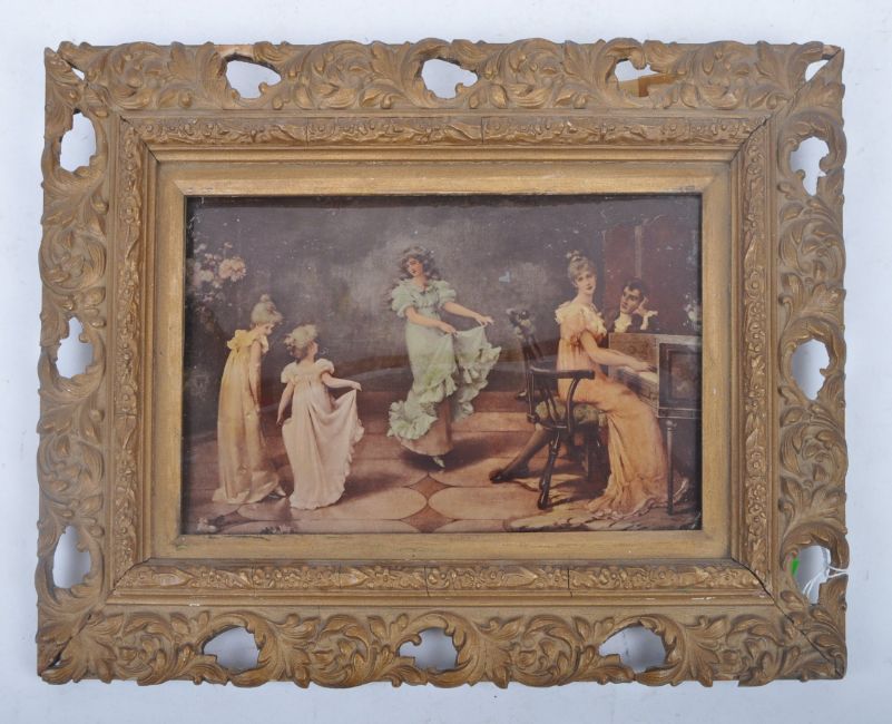 A mid nineteenth century Regency style enamel glass painting depicting three young girls dancing while their mother plays the piano. The glass being convex. Presented in a contemporary gilt wood & gesso frame. Measures approx. 24cm x 15cm, 38cm x 29cm to include frame.