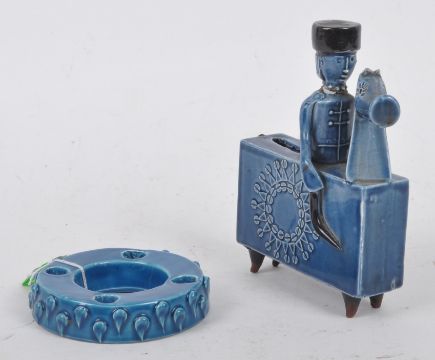 In the style of Bitossi - a blue mid 20th century continental moneybox shaped as a square horse, with riding soldier on horseback, mounted atop four black ceramic feet; along with a Bitossi style Italian ashtray in blue grey with four indents, marked Italy to base. Horse rider with head broken but present. Measures approx. 16cm.