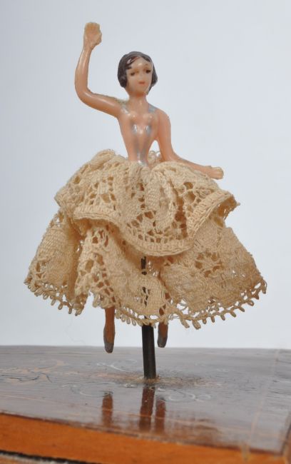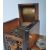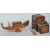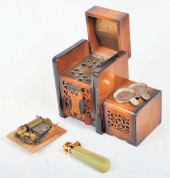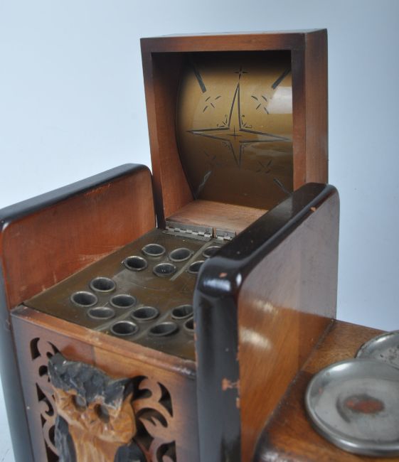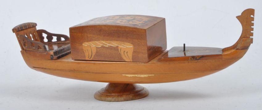Smoking Interest - a 20th century German marble cigar cutter, a mid century black forest marquetry cigarette holder / music box with decorative owl to the front, and a continental wooden gondola shaped cigarette holder / music box. Gondola to measure approx. 11.5cm x 32cm x9cm.