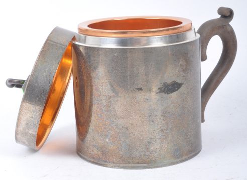 A large antique late 19th century pewter tankard with scrolling wooden handle, lined with white metal, with fitted lid with lidded handle. Repurposed with fitted copper ice bucket / wine cooler, with loose insert to the bottom allowing for melted ice. Lid of tankard similarly lined with copper. No evidence of maker's marks. Measures approx. 23cm x 25cm x 17cm.