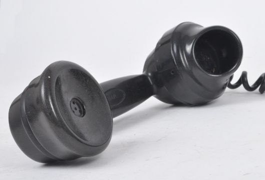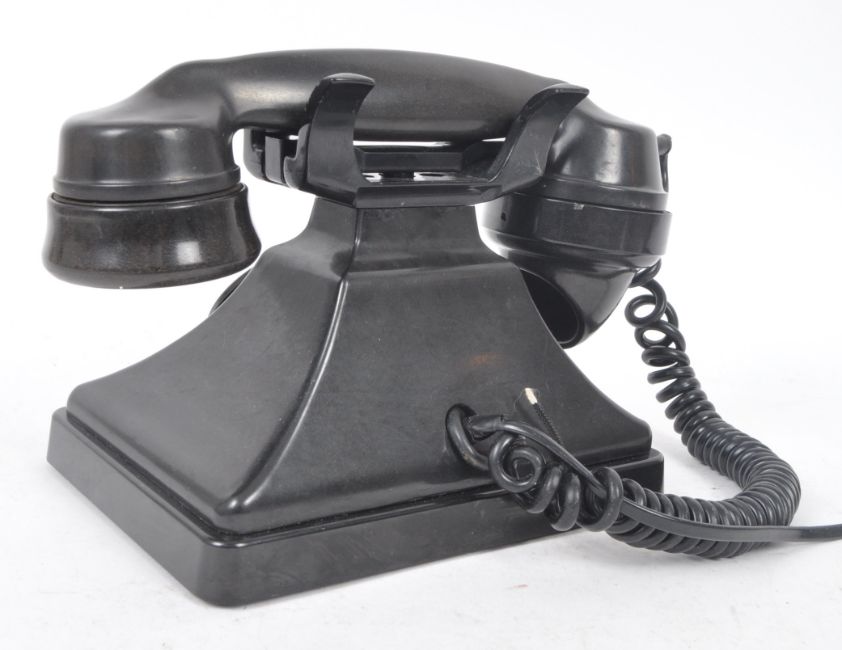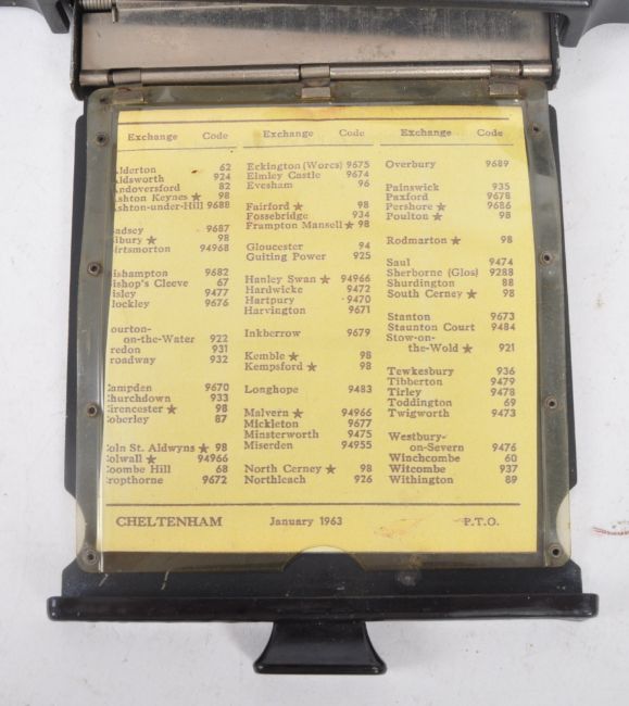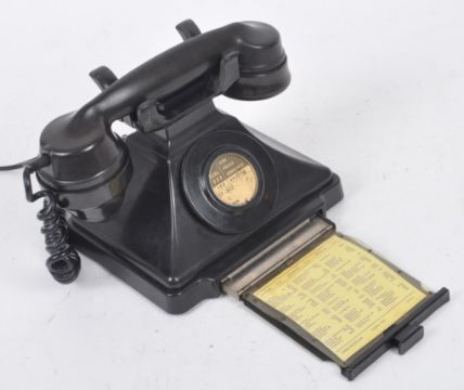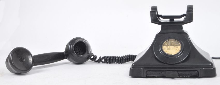 A retro mid 20th century circa 1950s rotary dial Bakelite pyramid telephone in black colourway. With drawer containing calling code card for Cheltenham. Adapted with wire for modern use. Sold as untested and a.f.