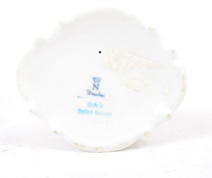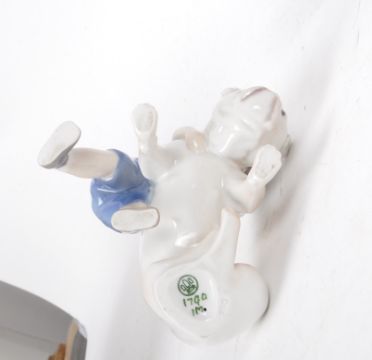 A collection of four 20th century continental decorative figures, comprising a Dresden white cherub figure warming its hands, a boxed Nao figure of a boy holding a bunny rabbit, a young girl with a snail crawling up her nightgown marked 'Rex Valencia', and a young boy embracing a bulldog, also marked to base. Tallest to measure approx. 23cm tall.