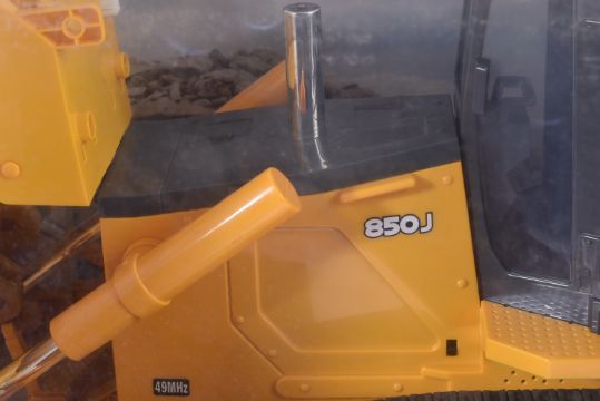 A large scale ERTL made RC Radio Control model of a John Deere Bulldozer. The model with moving blade, working headlights and all terrain navigation appearing unused within original packaging. Box measures approx 42x73x42cm.