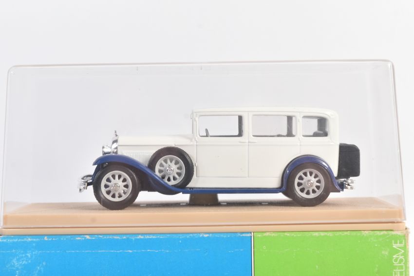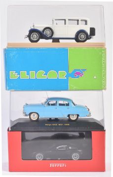 A collection of x3 assorted 1/43 scale boxed diecast model cars comprising IXO Models CLC032 Volga GAZ M21 1959, Fer013 Ferrari 575GTC (black) presentation version and a French Elicor made  Talbot Pacific 1930 Limousine. Contents appearing mint within original boxes.