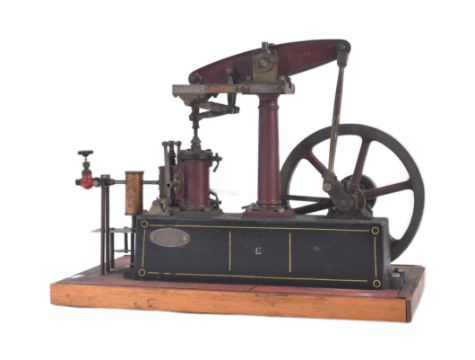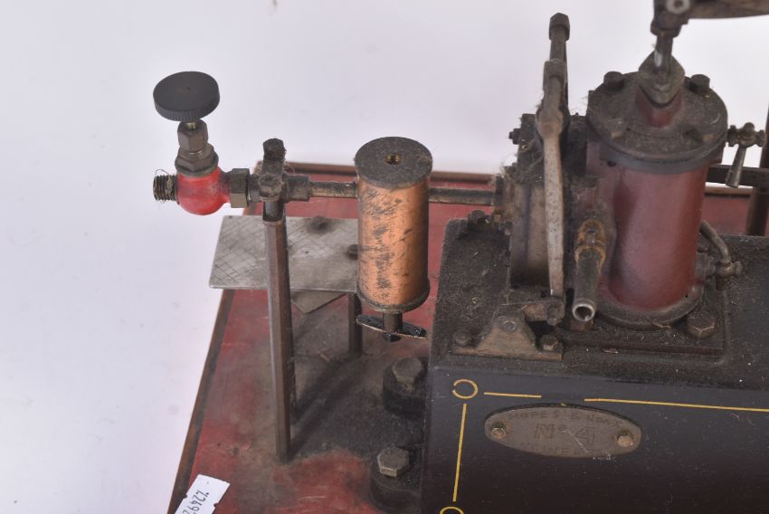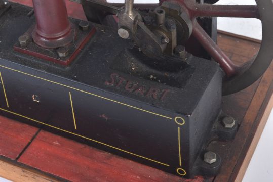 Live Steam - an original vintage Stuart Turner horizontal live steam engine with single cylinder mounted onto brass base. Fly wheel measures 18cm. Overall height including the wooden base approx. 31cm.