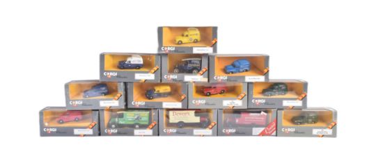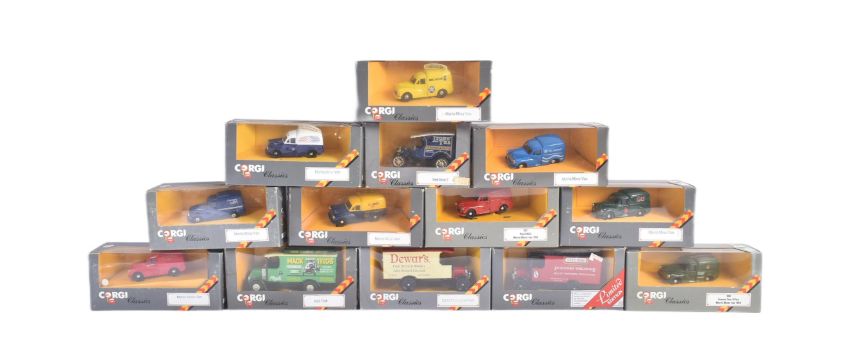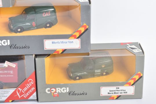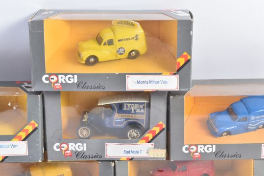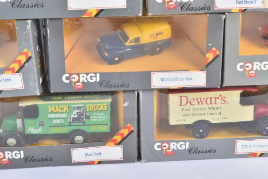 A collection of vintage Corgi Classics diecast model vans to include; Mack Truck, Thornycroft Van, Morris Minor Van, Ford Model T and others. Models appearing VG+ and likely unused. Some loose from inner packaging.