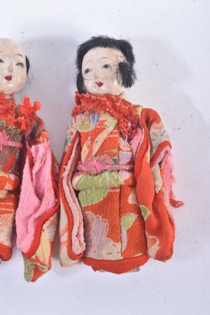 Dolls - two late 19th / early 20th century composition Japanese dolls. Composition heads and limbs with traditional costumes. Both with inlaid black hair and inset glass eyes. One doll with damage to feet, otherwise complete. Each measures approx; 8cm tall.