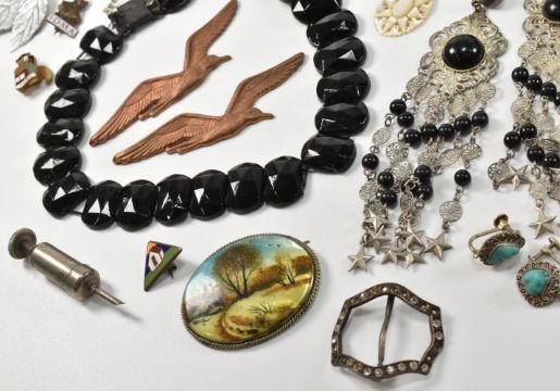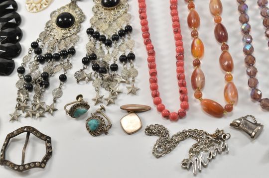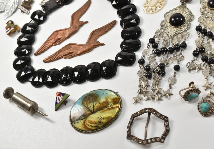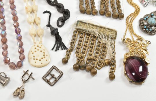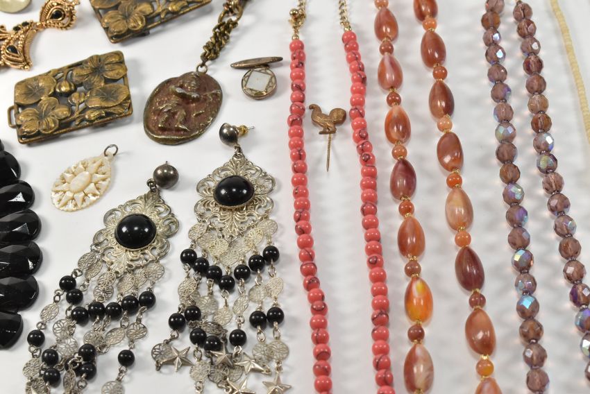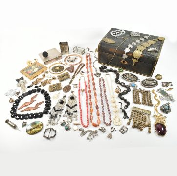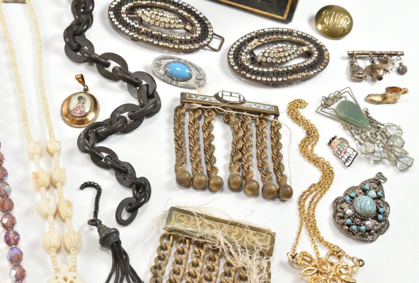 An assorted collection of antique and later costume jewellery. The lot to include gold and silver tone metal, chains, necklaces, pendants, bangles, bracelets, earrings, cufflinks, charms, brooch pins, buckles, AF jewellery fragments, buttons, jewellery boxes, birds, white stones, coloured stones, belt buckles, floral flower design, brass tones, micro mosaic, enamel, koala, pansy, compact mirror, cigarette case, mother of pearl shell, chatoyant stone, Czech style, bone, stick pins, simulated stones, filigree, niello, wire work, pocket watch chain, drop earrings, screw back earrings, Victorian vulcanite, aurora borealis beads, simulated jet and more. Total weight approx 1762g. Largest measures approx 75cm. All weights, measurements and sizes are approximate.