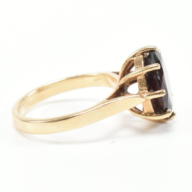 A vintage hallmarked 9ct yellow gold and garnet solitaire ring. The ring having an oval cut prong basket set garnet to pinched cathedral style shoulders and a straight shank. Hallmarked for Birmingham 1978, sponsors for GLd. Stone measures approx 10x8mm. Total weight approx 2.7g. Approx size G.5. All weights, measurements and sizes are approximate.