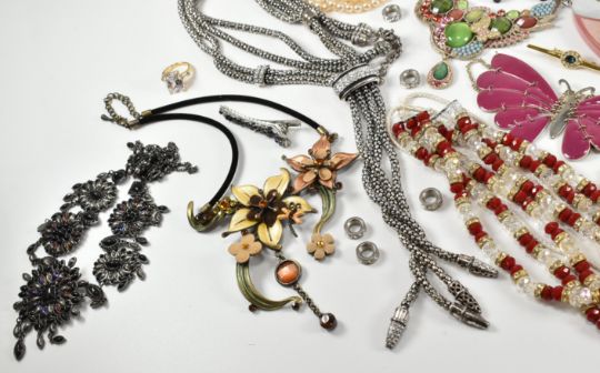 An assorted collection of costume jewellery. The lot to include gold and silver tone metal, necklaces, rings, watches, earrings, beads, hair accessories, white stones, various coloured stones, bows, net, brooches, hairbands, chains, animal print, flowers, sequins, glitter, enamel, simulated pearls, bolo tie style, aurora borealis stones, statement design, shell, butterflies, hematite, arts and rafts style, simulated tortoiseshell, cubic zirconia, engagement style ring, lace, stick pin, hair clips and more. Total weight approx 2008g. Largest item measures approx 60cm. All weights, measurements and sizes are approximate.
