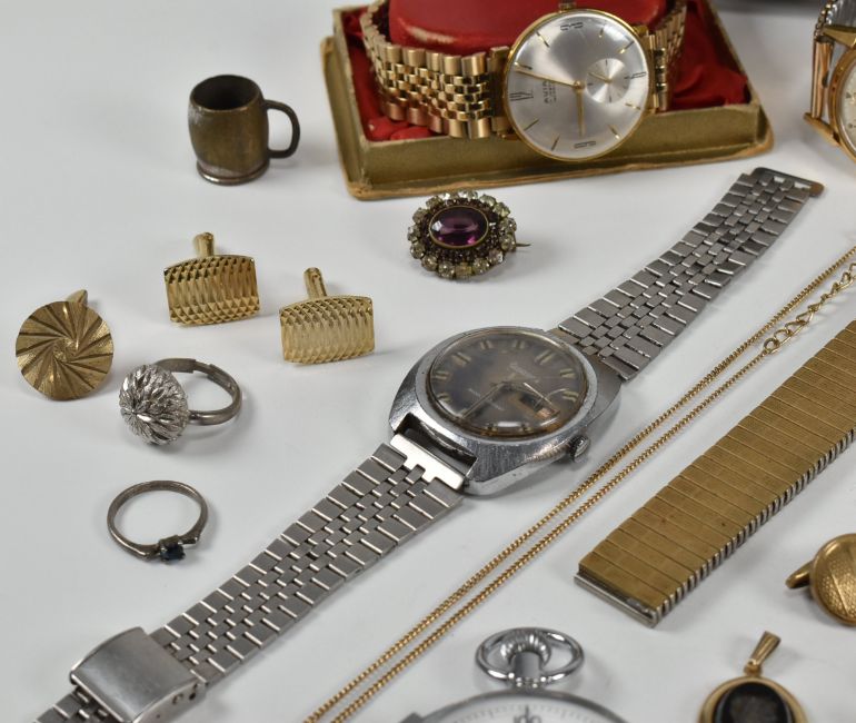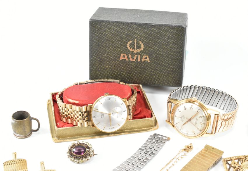 An assorted collection of wristwatches and costume jewellery. The lot to include a gold tone Avia 17 jewels incabloc stainless steel Swiss made wrist watch in original box, a purple and white stone cluster halo brooch pin with C clasp verso, Technos antimagnetic 21 rubis waterproof incabloc watch, Garrard pocket watch, Timemaster shock resistant watch, twisted bangle bracelet, gold plated curb link necklace chain and white stone heart pendant, watch strap, AF jewellery fragments, molar crown, simulated pearls, purple stones, shield brooch, coin pendant, cufflinks, tie clips, rings, intaglio and more. Total weight approx 436.6g. Largest item measures approx 13cm. All weights, measurements and sizes are approximate.