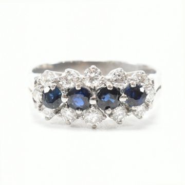 A vintage platinum and 18ct white gold, sapphire and diamond dress ring. The cluster ring having our round cut sapphires to the centre encompassed by a halo of graduating round cut diamonds to scalloped split shoulders and a straight shank. Marked PLAT 18ct. Total weight approx 5.8g. Approx size N. All weights, measurements and sizes are approximate.