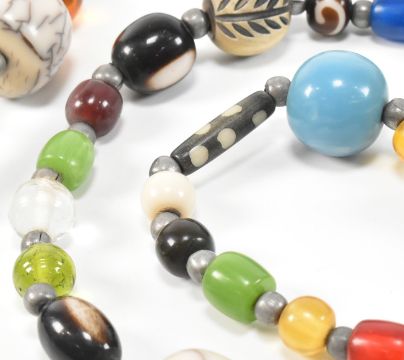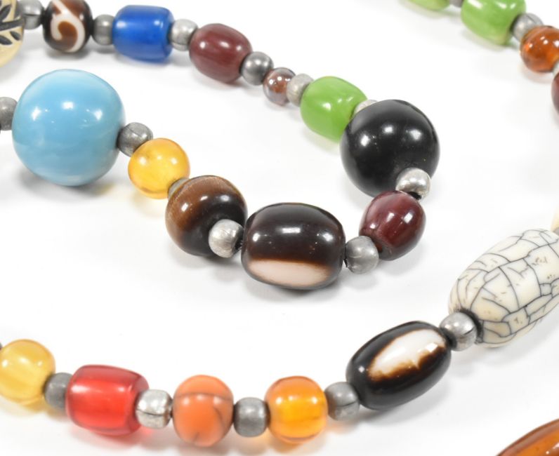 A vintage dzi trade bead style necklace. The necklace comprised of a variation of plastic, wood, metal, bone, glass, stone and dzi style beads in multi coloured examples. Total weight approx 192g. Measures approx 150cm. All weights, measurements and sizes are approximate.