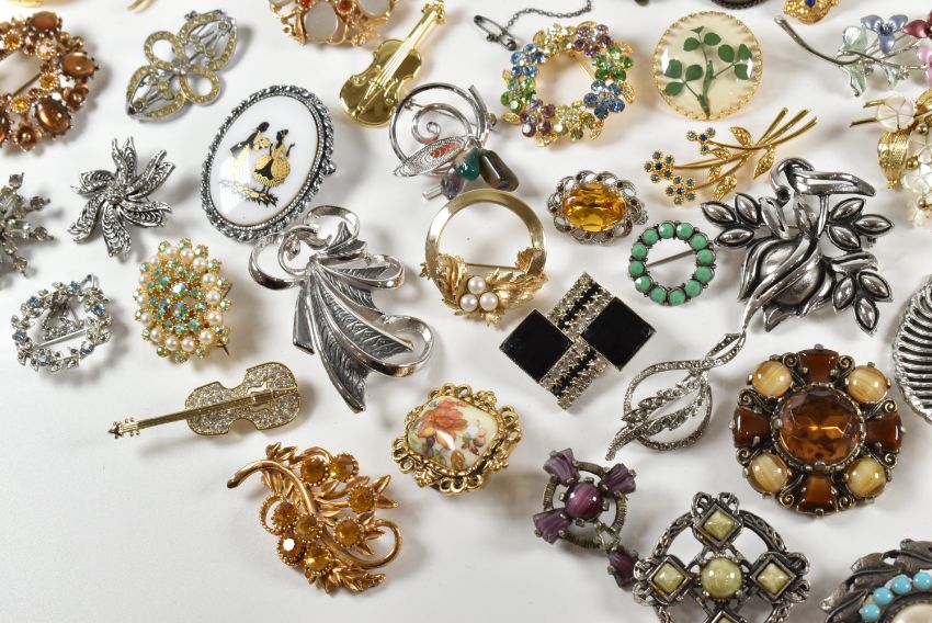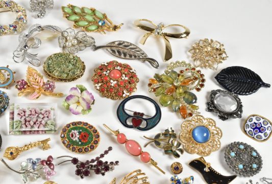 An assorted collection of vintage and later brooch pins. The lot to include hallmarked silver, gold and silver tone metal, white stones, simulated pearls, various coloured stones, aurora borealis stones, mother of pearl shell, glass, ceramic, micro mosaic, millefiori, flowers, hearts, plastic, leaf, enamel, scarf clips, bow, Scottish style, key, chatoyant stones, Czech style, pixie, marcasite, carved cameo, chain, Essex crystal style, guilloche enamel, roundel, filigree, Avon, Garnet, tigers eye, abalone shell, pressed clover, niello, baby and more. Total weight approx 1126g. Largest measures approx 5.5cm. All weights, measurements and sizes are approximate.