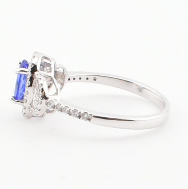 A hallmarked 18ct gold and tanzanite diamond ring. The ring set with a central oval cut tanzanite framed by round brilliant and baguette cut diamonds. Weight 2.9g. Size N.5. All weights, measurements and sizes are approximate.