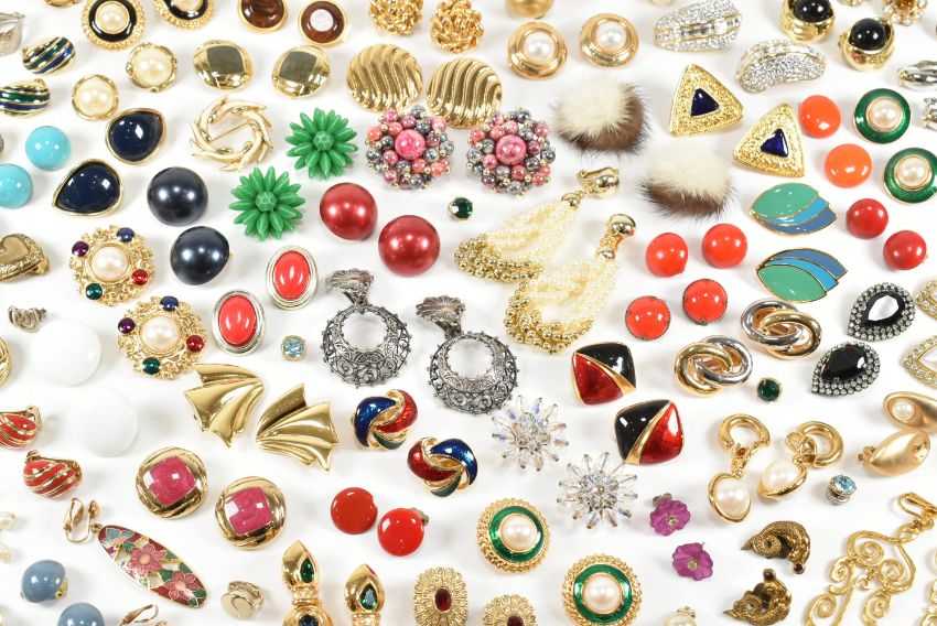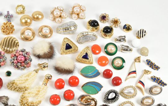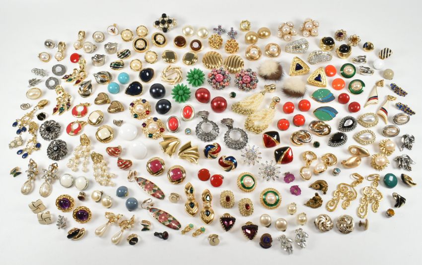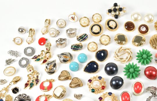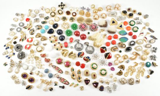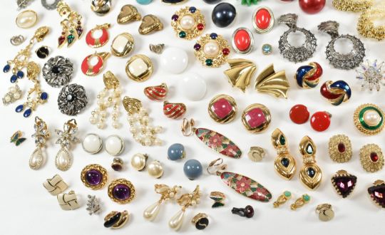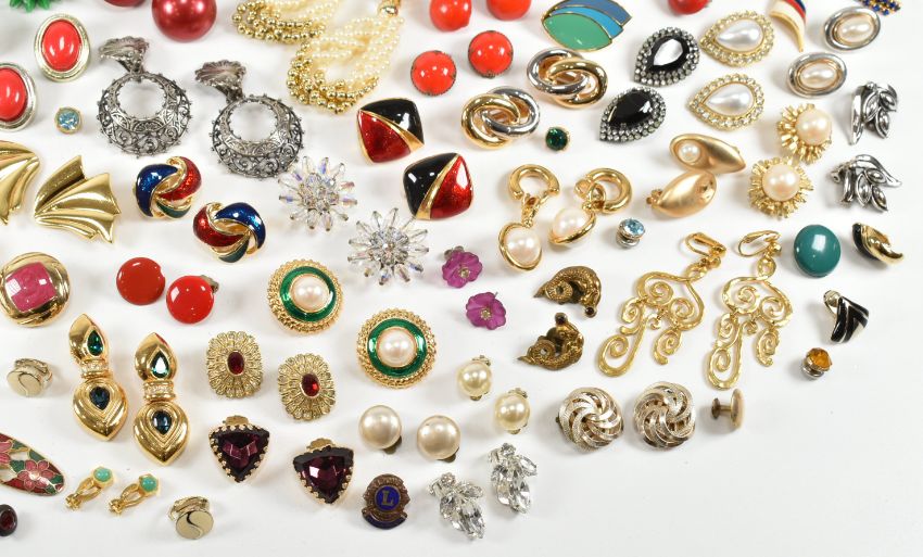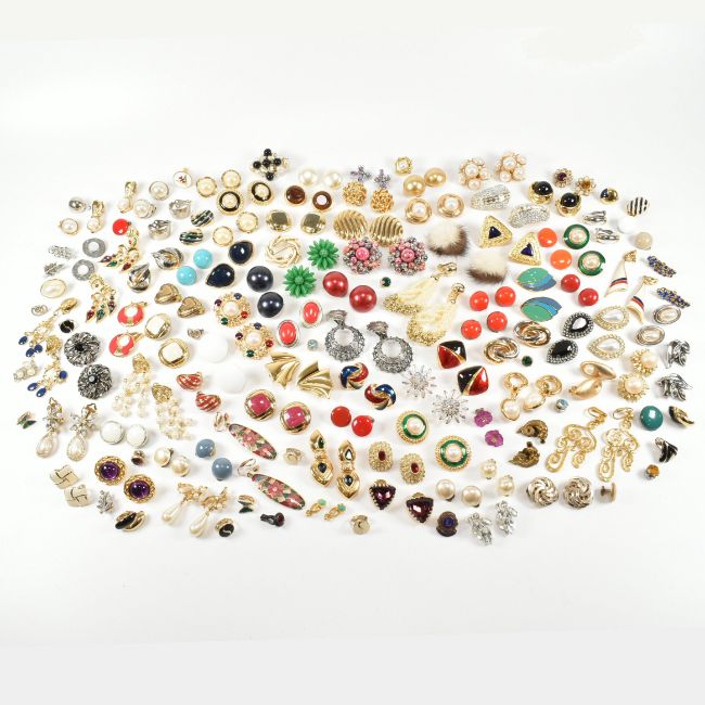 An assorted collection of vintage and later earrings. The lot to include gold and silver tone metal, gold plating, simulated pearls, white stones, halo, cluster, various coloured stones, enamel, plastic, beads, ceramic, flowers, aurora borealis, studs, drops, clip on, cloisonne, two tone, plastic, buttons, hoops, chatoyant stone, hearts, planished metal, butterfly, marcasite, jewellery boxes and more. Total weight approx 1196g. Largest measures approx 6cm. All weights, measurements and sizes are approximate.