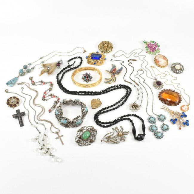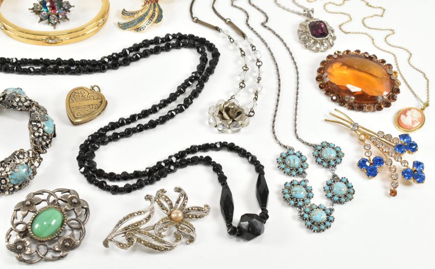 An assorted collection of costume jewellery. The lot to include gold and silver tone metal, white stones, coloured stones, cloisonne, marcasite, simulated pearls, rolled gold, grouse foot, brooches, bangle, pendant, locket, hearts, chains, enamel, flowers, chatoyant stone, bracelet, beads, crucifix, scarf clip, simulated turquoise, necklace, cameo, roundel, festoon, ceramic and more. Total weight approx 355.2g. Largest item measures approx 106cm. All weights, measurements and sizes are approximate.
