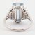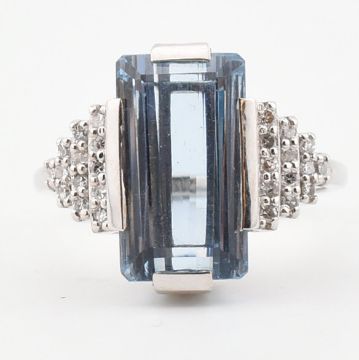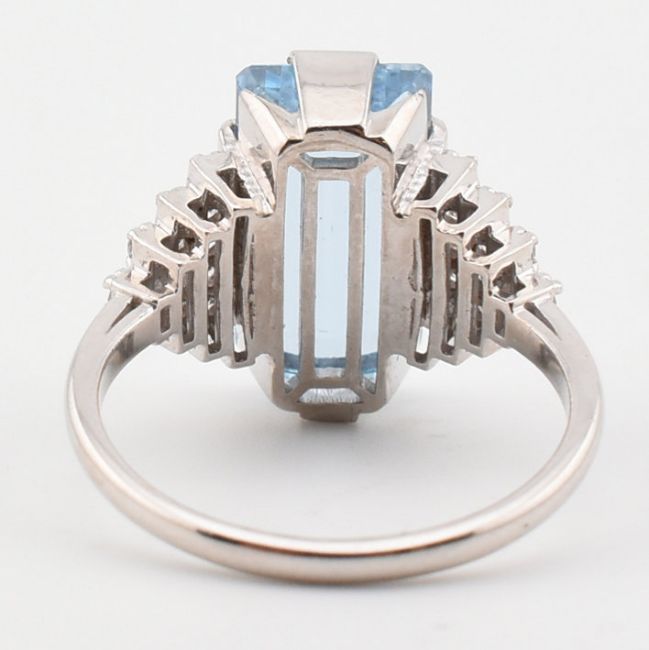 An 18ct white gold aquamarine and diamond ring. The ring set with a step cut aquamarine flanked by diamond set terraced shoulders to plain band. Weight 7.5g. Size Q. All weights, measurements and sizes are approximate.