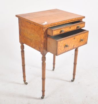 A George III 19th century birds eye maple two drawer side table / ladies work table. The occasional table having a squared, flared edge top over a pair of graduating drawers with twin pull handles. Raised on turned supports with beehive detailing atop. Brass cap castors to ends. Measures approx. 75cm x 50cm x 38cm.