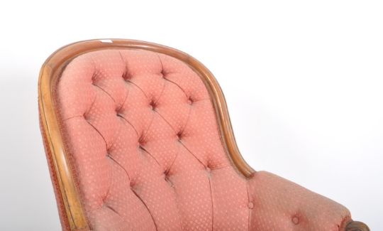 A 19th century Victorian mahogany framed spoon back salon chair / armchair having pink button back upholstery with padded armrests and carved scrolled frame. All raised on thick reeded supports upon brass castors. Measures approx. 95cm x 71cm x 90cm.