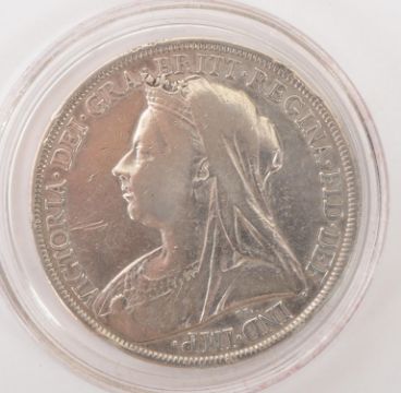 A 19th century Victorian 1897 silver crown coin. The coin to depict St George on horseback to reverse and veil head Queen Victoria to obverse with legend to surround. Weight approx 28g.