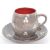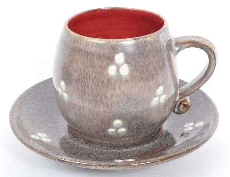 An English earthenware tea service set by Clevedon Pottery (Elton Ware). Comprising of; ten tea cups, four coffee / espresso cups, fourteen saucers. Having hand painted green circular / abstract leaf design with and red internal to eight cups. Decorators mark to underside.