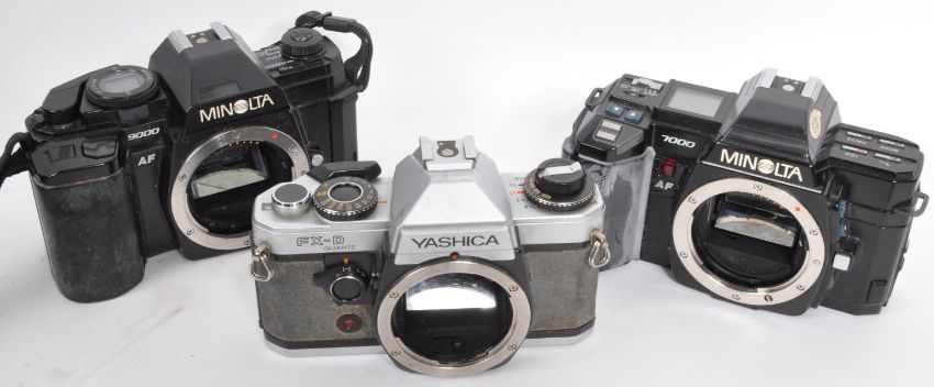 A collection of retro vintage 20th century cameras, lenses & camera equipment. The lot to include Yashica, Canon, Olympus, GB Kershaw, Minolta cameras. Along with Vivitar, Sunagor, Miranda, Pentax, Olympus, Tokina and Sigma lenses. Camera strap, tripod stand in leather carry case & camera carry case also included.