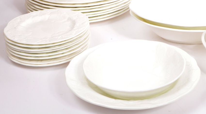 A contemporary Wedgwood bone china porcelain extensive tea / dinner service / set in the strawberry and vine pattern. Comprising of, dinner plates, soups, gravy boat, lidded serving dish, serving bowls, sugar bowl, platter, side plates and breakfast cereal bowls. Measures approx. 39cm x 30cm