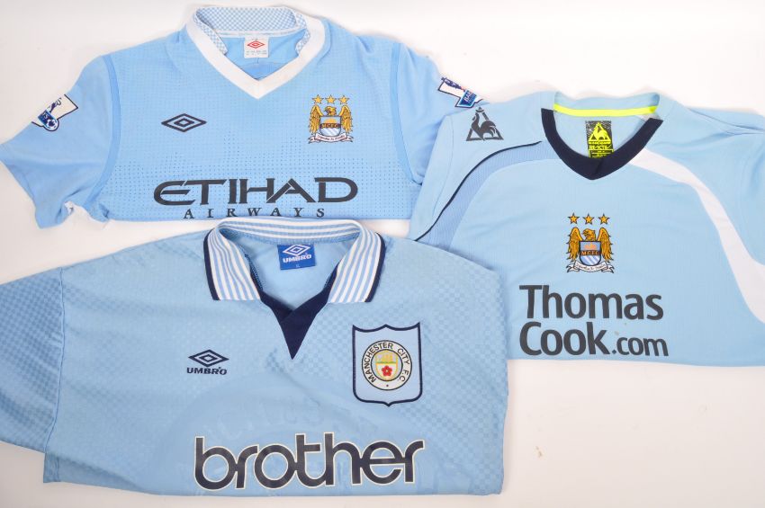 A large collection of vintage 20th century and later Manchester City Football club shirts, T shirts and football shirts. Featuring le coq sportif home shirt, FA cup final 2011 polo shirt, FA cup final 2013, 1969 long sleeves red and black stripes FA cup final, score draw label Man City shirt, hoodie jumper and many other examples. Most sizes large / extra large, one having Shaun Wright-Phillips on back and another signed. Brother Umbro 95 / 96 season, Etihad Champions 2013 / 2014 seasons Kun Aguero on back, 2003 / 2004 first advice replica, 1997 / 1999, 2006 / 2007 away black shirt, 2004 / 2005 replica, 2000 / 2001 Eidos, 2002 / 2003 home kit, 2008 / 2009, 97 / 98 away, 99 / 01 away white shirt, 2006 / 2007, 1997 / 1998 away white and claret.