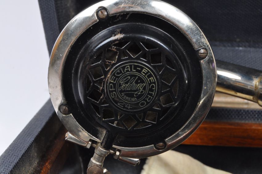 An early 20th Century retro vintage portable Goldring Special Electro 24 gramophone with grey lucid marbled effect in a black colourway carry case. Measures approx 41cm x 30cm.
