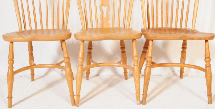 Three retro mid 20th century oak wood crinoline stretcher Windsor style country kitchen / dining chairs. Two having stick back design with shaped seat, raised upon turned legs, whilst the third having a pierced shaped decorative slat to the centre of the back. Measures approx 95cm x 43cm x 39cm.