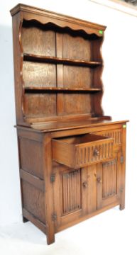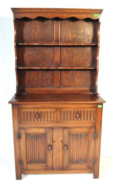 A Jaycee Old Charm - Wood Bros manner 20th century Oak dresser. The dresser with a  carved pelmet with two shelves, two drawers and a twin door cabinet with one internal shelf. Measures approx. 180cm x 87cm x 45cm.