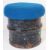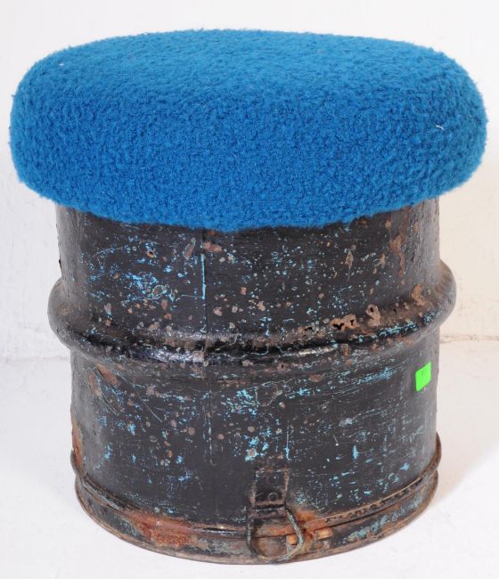 A retro 20th Century upcycled industrial oil can seat / stool of cylindrical industrial drum shape form in black with boucle upholstered seating in a contemporary marine blue colourway. Measures approx 48cm x 49cm diameter.