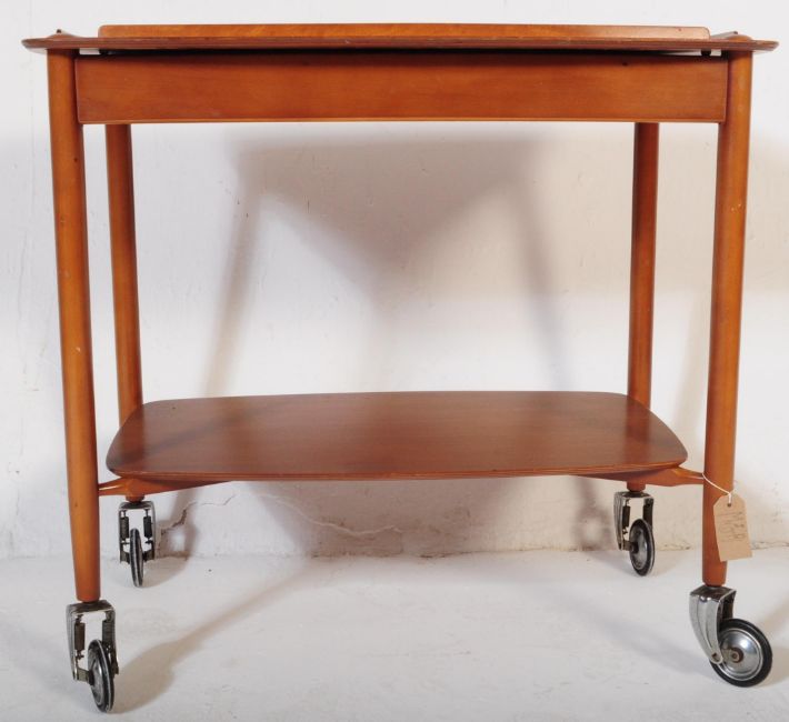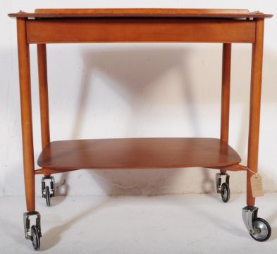 A retro vintage mid 20th century 1960s Danish style two tier teak tea / drinks / cocktail / butler / hostess trolley having a removable tray to top tier. All raised on cylindrical supports upon castors. Measures approx. 70cm x 79cm x 48cm.