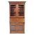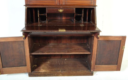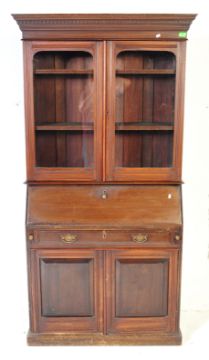 A Victorian style mahogany library bookcase cabinet. Raised on a plinth base with cupboards and bureau having short drawers beneath. Above, a twin glazed bookcase cabinet atop with flared pediment. Measures approx. 189cm x 92cm x 41cm.