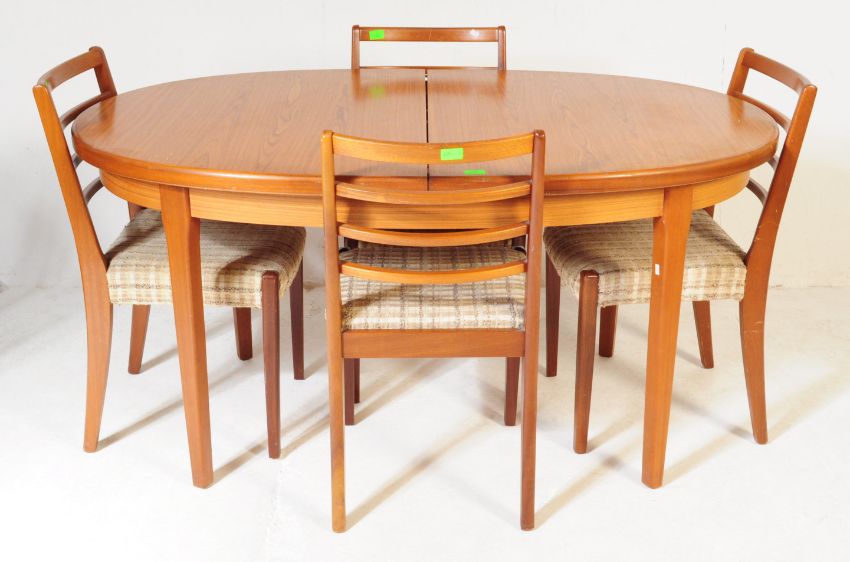 Late 20th century Danish manner teak wood dining table and chairs. The extending table with chairs having original upholstery. Measures approx. 74cm x 152cm x 198cm (extended) 92cm