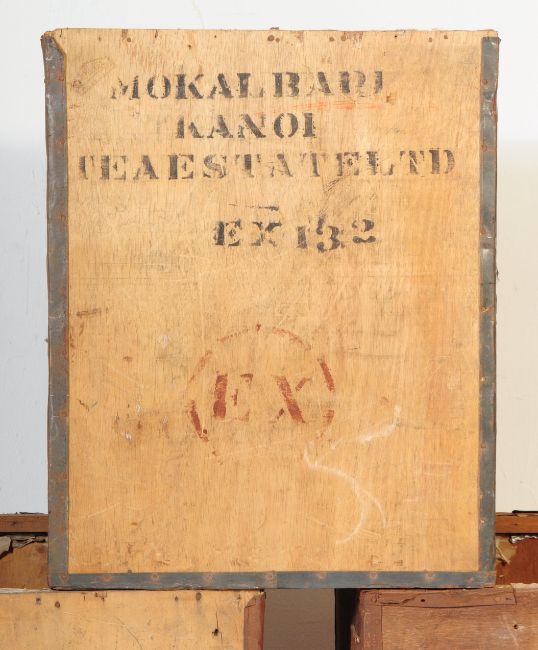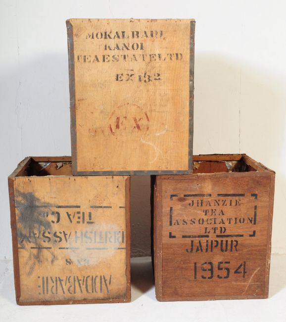 A selection of three Indian tea crates / packing cases.  Each annotated with information from the individual tea company including Jhanzie Tea Association of Jaipur dated 1954, Crossley & Towers Ltd of Calcutta and Mokalbari Kanoi Tea Estate Ltd.  All are constructed of plywood with metal edges and corners. Measures approx. 61cm x 49cm x 49cm.