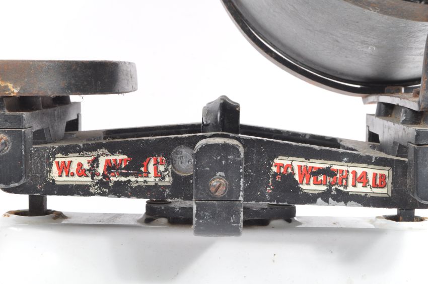 A vintage retro mid 20th century Avery cast metal grocers shop scales in a white colourway. Scoop measures 42cm length.