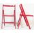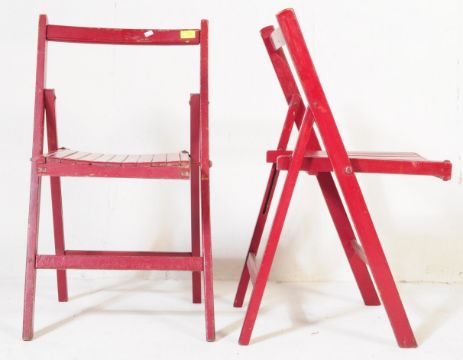 A pair of retro vintage 20th century wooden village hall folding dining chairs. Each chair having a single rail back support over a shaped seat. Finished in a cherry red colourway. Each measuring 80 x 46 x 46cm.