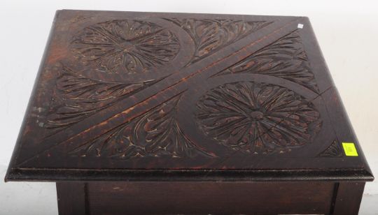 A 19th century Victorian Jacobean revival carved ebonised oak corner dining handkerchief drop leaf table having table top hand carved with foliates over barley twist supports.