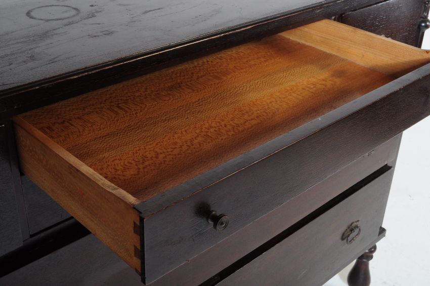 An Edwardian mahogany Art Nouveau chest of drawers. The chest being raised on turned legs with castors having short and deep drawer configuration being finished with a flared top above