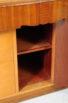 An Art Deco birds eye maple wood dressing table. With peach glass mirror back central and left only. Curved rectangular form with two hidden drawers with one central compartment flanked by bank of two graduating drawers raised on a plinth base. Measures approx.