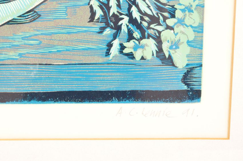 AC Lennie (British) - A late 20th Century, 1990's artist wood block print named 'Still Life. Signed in pencil by the artist to the lower right. Limited edition 18/26. Framed and glazed. Measures approx; 53cm x 44cm.
