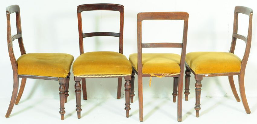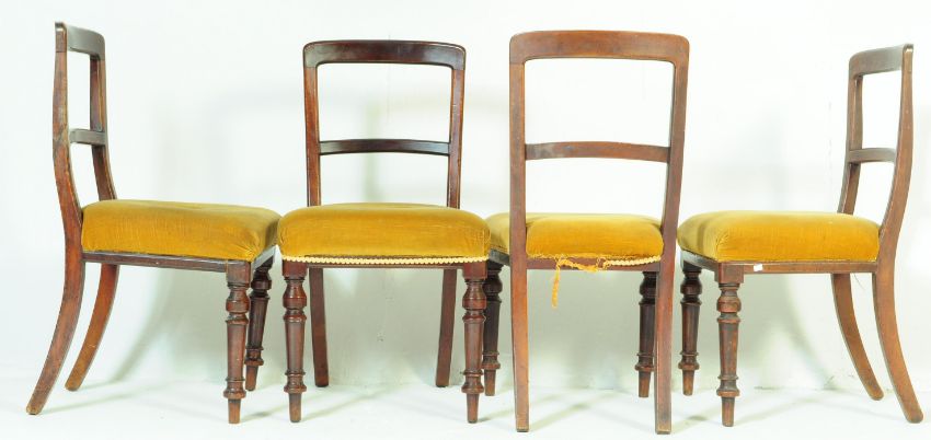 A set of six 19th century Victorian mahogany dining chairs having rounded top rails with cross rail within, raised over padded seat upholstered in a mustard velvet fabric, raised over turned and sabre supports.