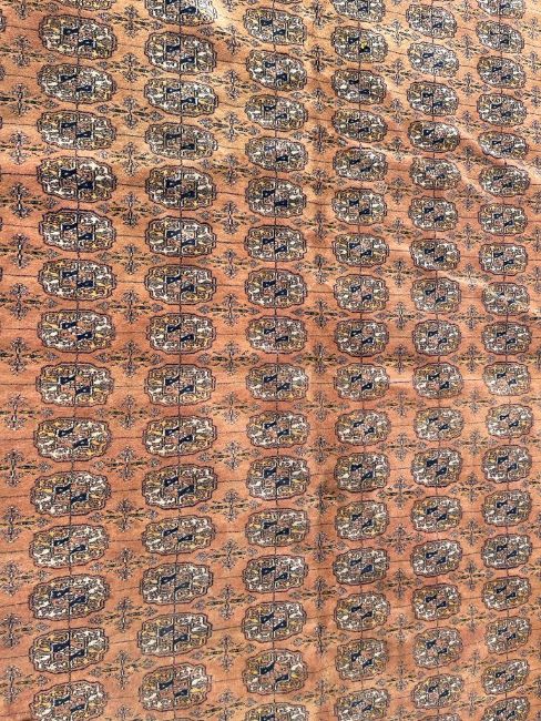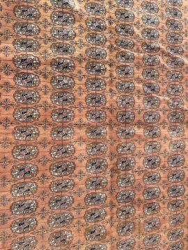 A large early 20th century Islamic Bukhara floor carpet rug. The rug having a soft red ground with field of gul motifs surrounded by a repeating geometric border.