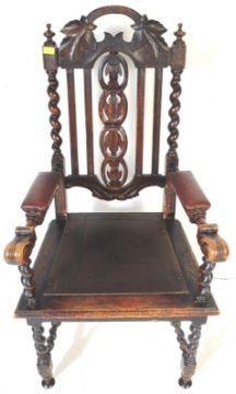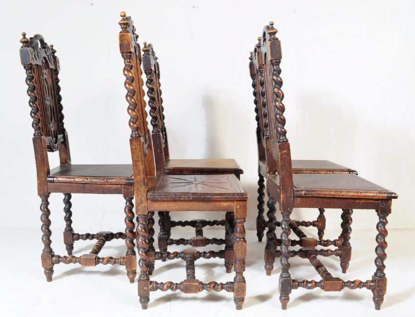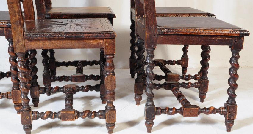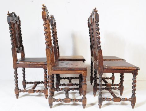 A set of six Victorian 19th century Carolean Revival gothic oak dining chairs, each having carved top rail over barley twist supports and squared seats. Five standards and one carver.