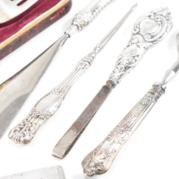 A collection of hallmarked silver and white metal flatware. The lot to include a Colibri monogas lighter. The lighter having an engine turned finish with monogrammed cartouche. A cased child's cutlery set. Hallmarked for Sheffield, date letter R for 1959. Hallmarked silver handled vanity items to include a shoe horn, tweezers and button hook with further hallmarked silver spoons. Combined weight approx 390g. Measures approx 4.5cm x 4cm / 16cm x 7.5cm.