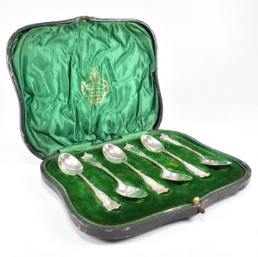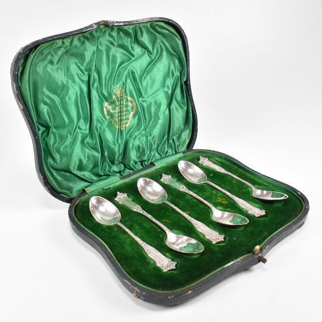 An Edwardian cased set of hallmarked silver tea spoons. The spoons having scrolled foliate decorated finials. Hallmarked for Sheffield 1906. Markers mark JR for John Roberts. In leather case for Alexander Clark Fenchruch Street London. Weight approx 83.5g. Measures approx 10.5cm.