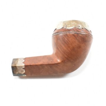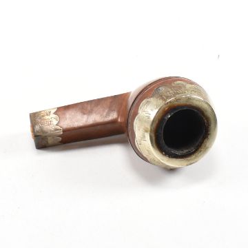 A cased hallmarked silver mounted pipe with cheroot and napkin ring. A cased George V hallmarked silver mounted walnut bulldog pipe. The pipe having a circular bowl and square shank and being mounted with hallmarked silver with etched pattern. Hallmarked for Birmingham, date letter L for 1910. Makers mark MF. A hallmarked silver cased napkin ring. Hallmarked for Birmingham, date letter P for 1939. Makers mark WA for William Adams Ltd. An cased early plastic cheroot with metal mount.  Combined weight approx 121.9g. Measures approx 16cm x 6cm / 8cm x 2.5cm.
