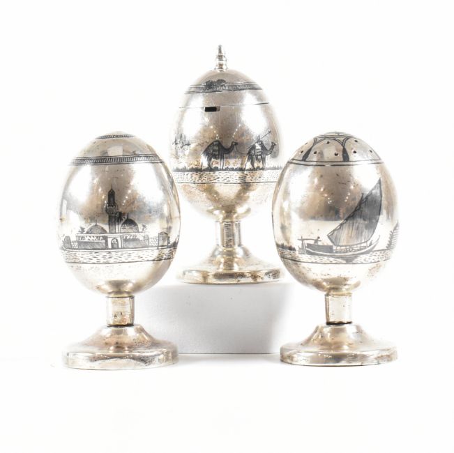 White metal and niello middle eastern 3 piece condiment set. The set consisting of a salt, pepper and mustard condiment jar with hinged lid. All being of egg shaped form and being decorated with middle eastern imagery and some text in niello. Surface tests indicate silver. The spoon is marked EPNS.  Combined weight (excluding spoon) approx 121.4g. Measures approx 6.5cm x 3cm.